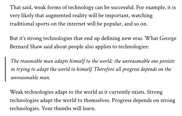 同时,链改游戏的模式也是一种cdixon讲的“弱科技”模式,可能看起来更接近主流受众,但是不会是下一个时代。弱科技的概念来自于cdixon的文章《强科技与弱科技》,一个技术总是以成对的形态出现。一种是弱科技版,看起来更接近主流,更容易落地;另一种一开始更像是一种玩具,但是却有开创一个新时代的潜力。比如,18,19年搞的很多无币区块链项目,还有联盟链+实体经济,供应链金融的项目就是弱科技;以太坊和Defi就是强科技。